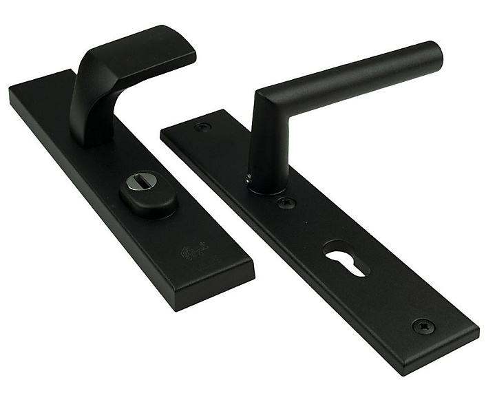 - inclusief: buiten- en binnenschild, gatdeel blokmodel deurkruk 374 M6 knop 145 VARO, Quickpuntschroef en drie RVS schroeven M6