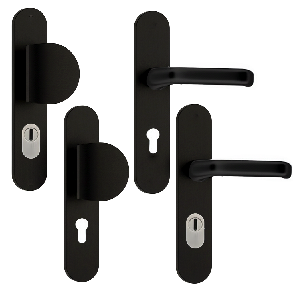 HVN zwart veiligheidsbeslag BREED kruk-kruk of greep-kruk. Combineer hier uw veiligheidsdeurbeslag. Binnen en buitenschild breed. Verkrijgbaar als Blind PC55 PC72 of PC92.