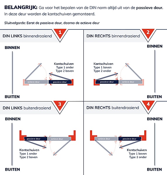 Voor de aanschaf is het belangrijk om te bepalen of je een type 1 of type 2 kantschuif nodig hebt. Dit is afhankelijk van de draairichting van de passieve deur. Per passieve deur heb je van beide types een kantschuif nodig. Voor een DIN rechtsdraaiende passieve deur gebruik je een type 1 kantschuif bovenaan en een type 2 onderaan de deur. Voor DIN links een type 1 kantschuif onderaan en type 2 bovenaan