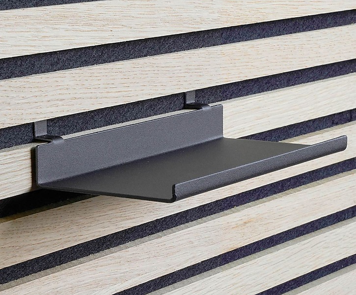 Zwarte wandplank voor akoestisch paneel. Een wandplankje voor je sleutels, portemonnee, kaartjes of fotolijstje op je akoestische wandpaneel bevestigen? Met deze stijlvolle wandplank maak je een isolatiepaneel helemaal af.