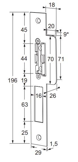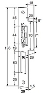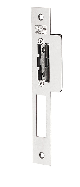 Maasland Arbeidsstroom elektrische inbouw deuropener met en lange rechte sluitplaat 3230N houdkracht met geïntegreerde schootgeleider en universele spoel die in het kozijn, tegenover de dagschoot van een mechanisch slot wordt ingebouwd, om deze te vergrendelen of te ontgrendelen. De schootgeleider duwt de dagschoot uit de schootvanger van de elektrische deuropener zodat, zonder lelijke uitsparingen in het kozijn, de deur kan worden ontgrendeld. De lange sluitplaat is speciaal gemaakt ter vervanging van de Nemef P646 rechthoekige sluitplaat.