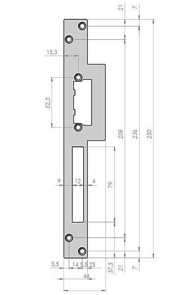 16HZLAP RVS lange voorplaat met nachtschootuitsparing voor gebruik bij elektrische sluitplaten 3mm vlak voor gebruik bij houten kozijn.