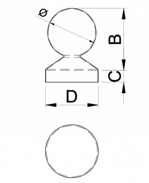 Paalkap met bol Ø60. Bolvormige paalkap met ronde voet. Met deze afdekking kunt u een ijzeren paal afsluiten of een betonnen pilaar of houten paal verfraaien of bedekken.