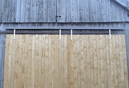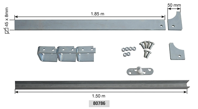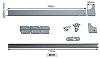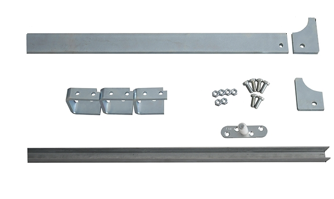 Schuifdeur montageset voor hangrollen met platstalen rails, geleidewiel en houders. Beslagset voor deurbreedte van 1 meter. Bij hangpoorten en deuren breder dan 1 meter kun je de looprail met een extra set uitbreiden. Schuifpoortbeslag met montagemateriaal waarmee de poortrail op de goede afstand van van de muur te monteren is. De montageset word geleverd inclusief geleidewiel en een geleiderail voor een optimale geleiding. Door de meegeleverde eindstoppen kan de hangpoort niet van de rail schuiven. Complete set voor schuifdeuren, schuifpoorten, boeren deuren en staldeuren.