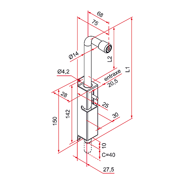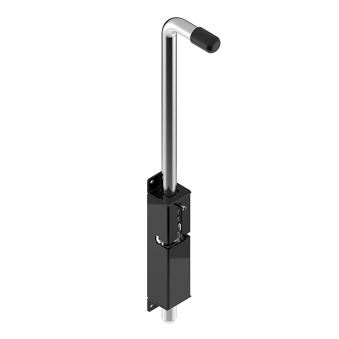 Opbouw pengrendel met veerbelaste stangterugtrekking na ontgrendeling. Poortgrendel met RVS 304 slotkast in gecoat zwart RAL 9005 behuizing. De stang van deze veergrendel is gemaakt van geanodiseerde aluminium en heeft een uitval van 40mm. De interne veer in de poortgrendel drukt de pen omhoog zodat deze open blijft in de open positie. Deze poorthendel is verkrijgbaar in diverse lengtes als 600mm of 350mm.
