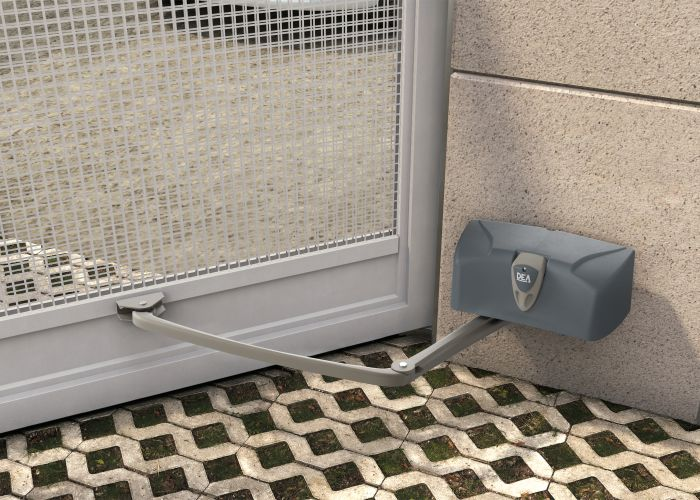 DEA LIVI 502 knikarm poortaandrijving Kit 24V of 230V poortvleugels tot 4 meter en 400Kg. De elektromechanische automatisering LIVI 502 is de motor met arm die grote poorten met vleugels tot 4 meter lang en tot 400 kg zwaar kan bewegen.