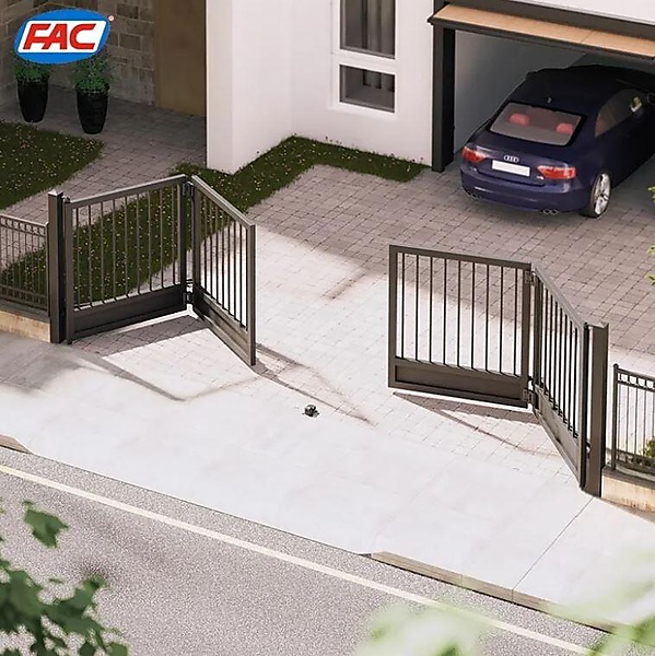 FAC Bi-Folding gate kit voor vouwpoort. Kit voor één poortvleugel tot 4 of 8 meter per vleugel. Wanneer een traditionele draaipoort simpelweg te veel ruimte inneemt, of wanneer een schuifpoort niet past door beperkte zijruimte of obstakels, biedt de FAC Bi-Folding vouwpoort kit een slimme en ruimtebesparende oplossing. Dankzij het vouwmechanisme wordt een lange poortvleugel in twee gelijke delen gevouwen, waardoor de poort opent binnen de helft van de normale draaicirkel. Ideaal voor korte opritten, steile hellingen of situaties waar voertuigen dicht bij de poort staan.