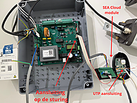 UTP kabel wordt verbonden met het Cloud toestel (ovale gedeelte), deze wordt verbonden met 4 draadjes op deel 2 van de module (rechthoekig) die vervolgens wordt verbonden met de sturing. Dat is alles.