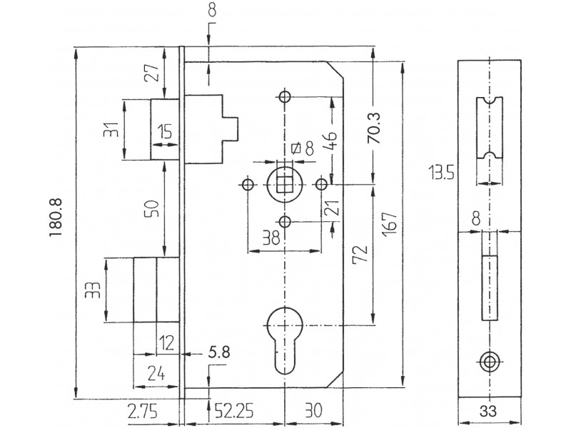 Bever 400P4 binnenwerk voor poortslot PC72mm en doornmaat 55mm Insteekslot met elektrolytisch verzinkt slot voor slotkast 40 mm en met voorplaat 33mm, doornmaat 55mm.