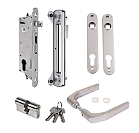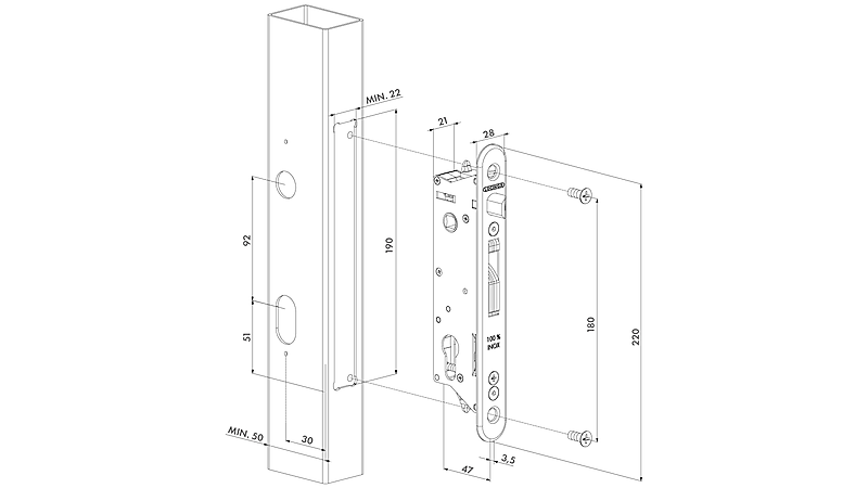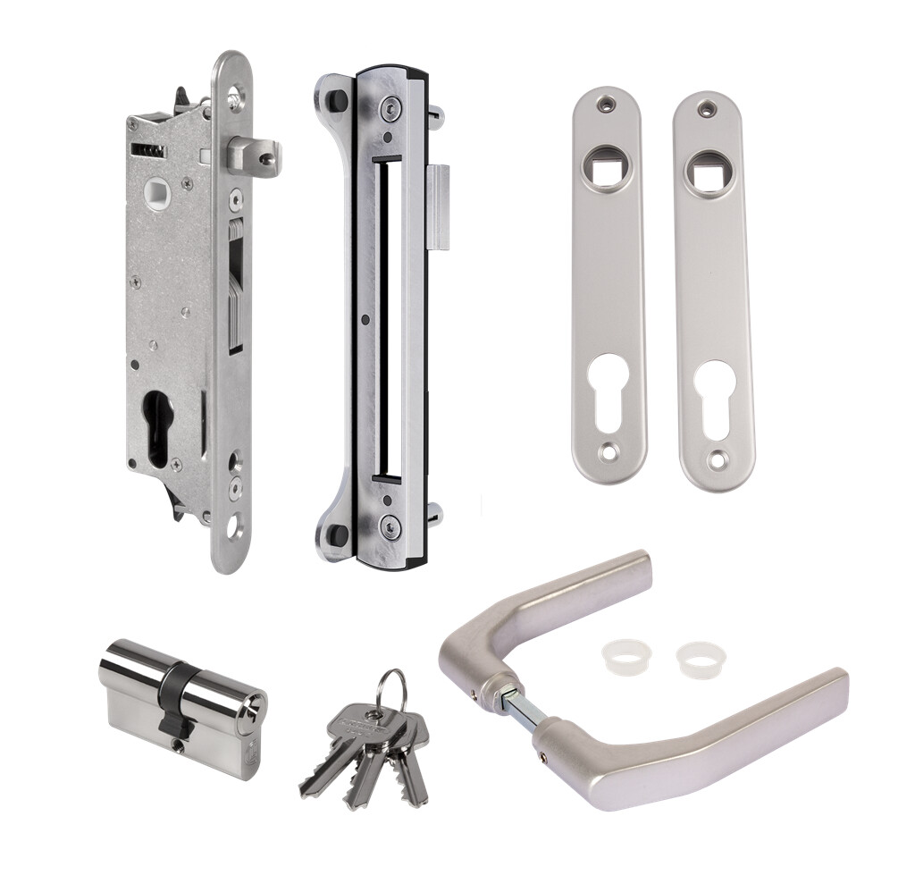 Locinox Fiftylock set met insteekslot en slotvanger en doornmaat 30mm. Complete Fiftylock set voor het uitrusten van metalen, aluminium of PVC poorten met een 10 mm regelbaar insteekslot en inbouw slotvanger. Een veilige verankering van de poort is gegarandeerd. Set met roestvrijstalen of polyamide afdekplaten, krukken en een 54 mm cilinder