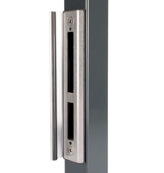 Locinox SHKM slotvanger voor insteeksloten. Aluminium aanslag voor Hybrid inbouwsloten als de H-metal en H-wood insteeksloten van Locinox . Deze unieke aanslag in combinatie met de hybrid sloten garandeert een sterke verankering van de poort. Deze configuratie is voorzien van Quick-Fix bevestiging om op metalen/aluminium of houten palen te monteren.