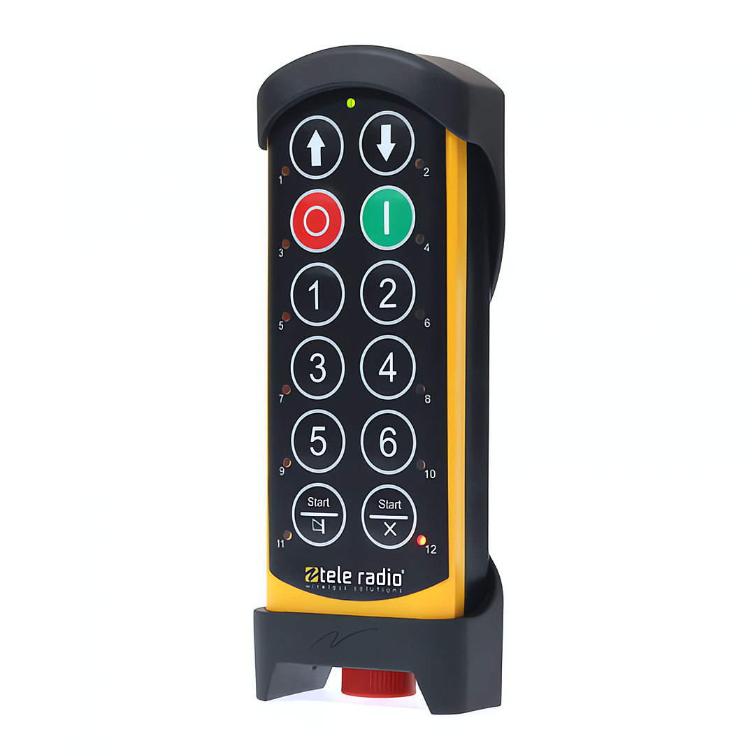 De TeleRadio zender, 12x2-staps knoppen, PLd, CAT3 is een robuuste industriële handzender voor nauwkeurige draadloze besturing van machines en installaties. Dankzij de 12 dubbele (2-staps) knoppen is hij ideaal voor toepassingen waarbij proportionele of meertrapsbediening vereist is, zoals kranen en hijssystemen.