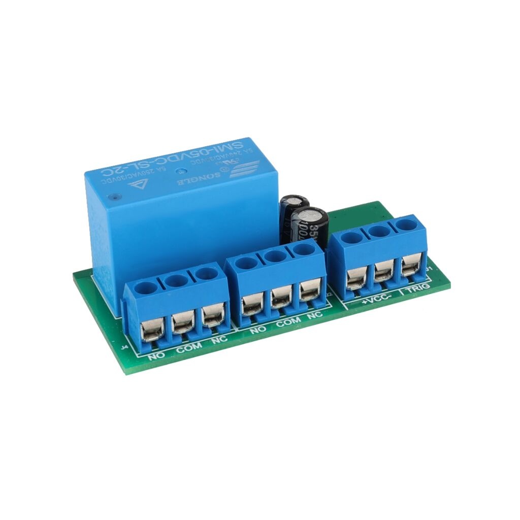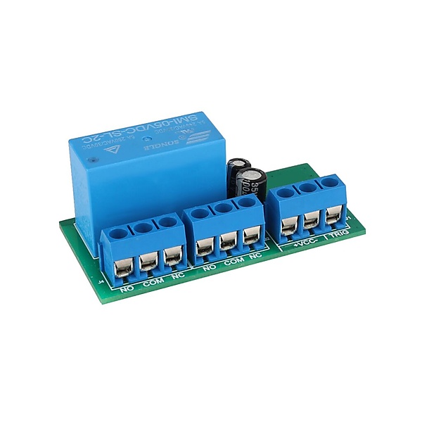 Maasland relaismodule met instelbare tijdsvertraging. Met deze relaismodule kan een stroom tot 5 Amp. worden geschakeld of een tijdsvertraging van 0,5 tot 60 seconden worden ingesteld
