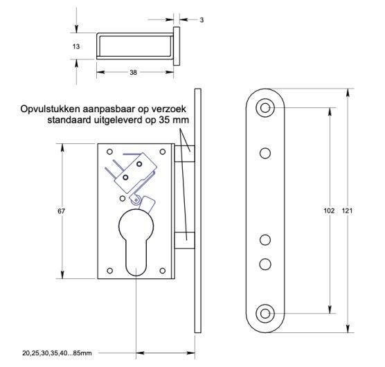- 11.: Afmetingen L x H x D voorplaat: 121 x 24 x 3mm