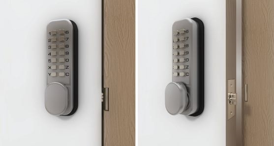 Maasland 255 codeslot met vrijzetknop en dagschoot. Deze stijlvolle mechanische codesloten zijn eenvoudig op de deur te plaatsen en worden geleverd inclusief dagschoot met dagschootblokkering of opbouw nachtschoot en sluitkom. Door het intoetsen van de juiste code is de knop te bedienen en kan de deur worden geopend. Na het openen van de deur vergrendelt deze, bij de dagschootuitvoering, na het sluiten automatisch. Bij de nachtschootschootuitvoering moet deze, na het sluiten van de deur, handmatig op slot worden gedraaid. Vanuit de binnenzijde is de deur altijd via de kruk mechanisch te openen. Codebediening enkelzijdig met vrijzetfunctie