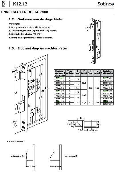 Sobinco 8001 smalslot 97 Het model 8001 van Sobinco is uniek in zijn soort, het enige slot met asafstand 97,3 mm. Deze sloten worden veelal gebruikt in aluminiumdeuren en vooral in de profielen van Reynaerts. De 8001 serie heeft een tuimelende nachtschoot of valschoot waardoor deze langer is als een standaard nachtschoot en dus verder in de sluitkant past.
