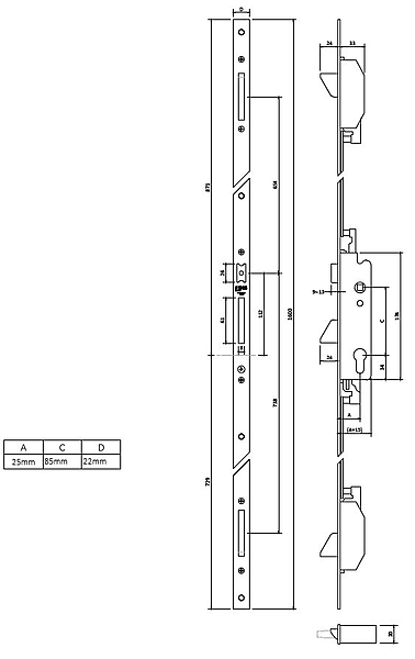 Meerpuntssluiting met PC 85mm en doornmaat 25mm met U-voorplaat. De lengte van de driepuntssluiting is 1600mm. Ruime keuze in insteeksloten met PC maat van PC85 mm.