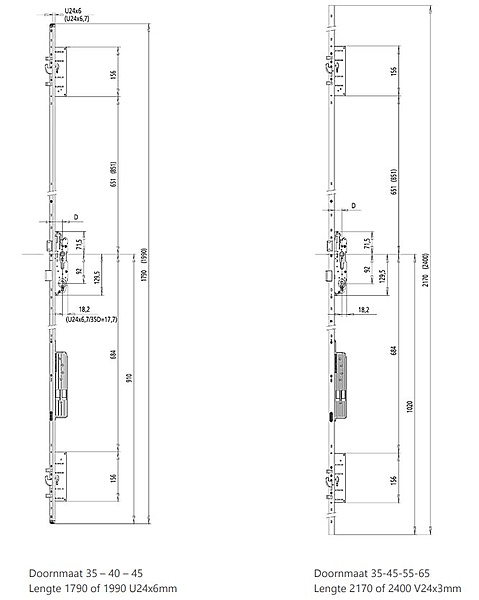 - Pen-haak-pen vergrendeling boven + onder en dag- nachtschoot in het midden