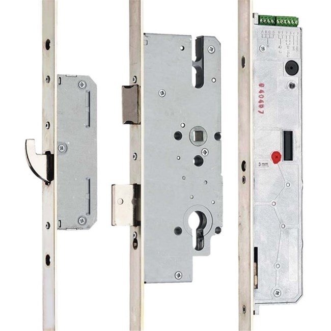 KFV GENIUS meerpuntsvergendeling met elektronische aandrijving. Speciaal-slot voor een automatische ver- en ontgrendeling vane deur. Deze beschikt over een geintegreerde elektronische besturing en een elektronisch aangedreven motor. Combineerbaar met radiografische afstandsbedieningen en tags. GENIUS wordt reeds in de fabriek met een sleutelbediende KFV-meerpuntsvergrendeling gecombineerd. Vanaf een doornmaat van 35 mm voor een profielcilinder met vrij-loopfunctie. De meerpuntsvergrendeling garandeert een perfecte vergrendeling van de deur.