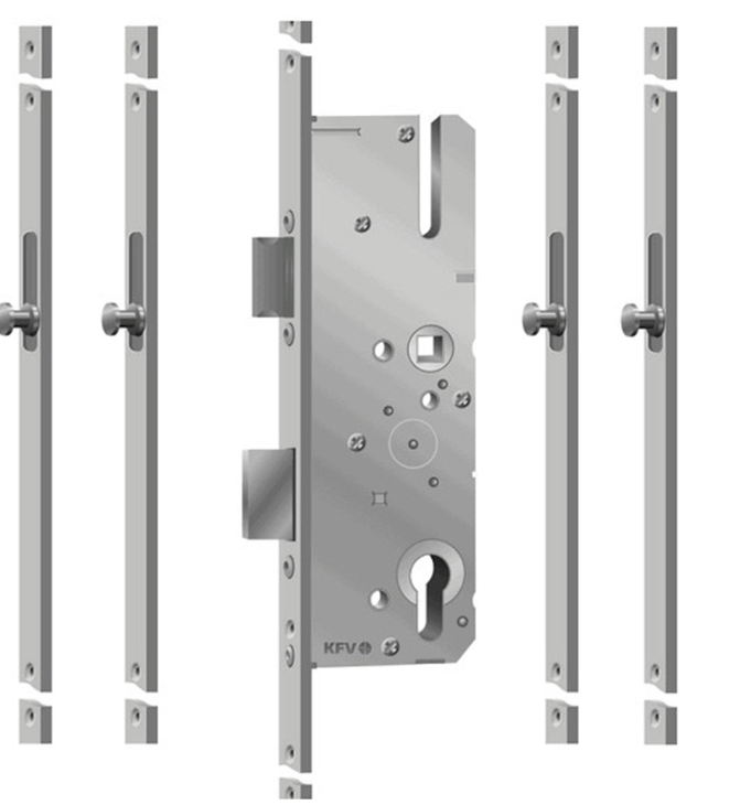 KFV AS8772 Cilinderbediende meerpuntssluiting met 4 rolnokken 72/55 VP20 R016 KFV meerpuntsluitingen zijn vervaardigd uit hoogwaardige materialen. Deze sloten onderscheiden zich door hun verscheidenheid voor zowel houten deuren als PVC- en aluminiumprofielen. Serie AS8772 is een allround-product voor de inbouw in al deze materialen. De 4 regelbare rolnokken zorgen voor een hoge dichting in combinatie met de sluitplaten. Deze verhinderen het kromtrekken van de deur.