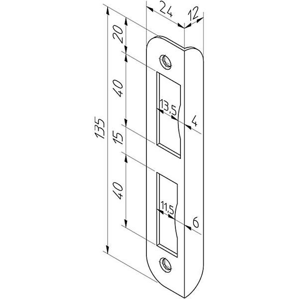 Nemef hoeksluitplaat hp1266/12 verzinkt draairichting 1 -3 of 2-4. NEMEF HP 1266/12 hoeksluitplaat voor dag- en nachtslot Ten behoeve van 1264, 1266, 1269, 1279/5, 1364 en 1366 Gegalvaniseerd staal, 135x24x12 mm voor opdekdeuren Draairichting 1.