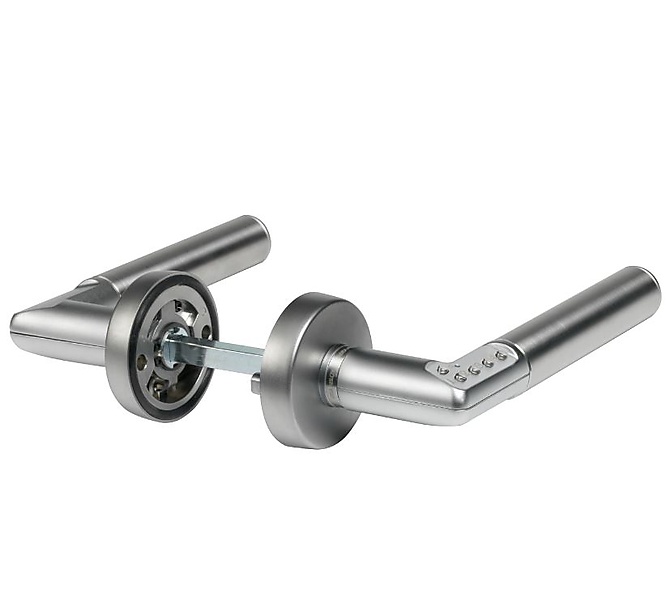 Yale Code Handle op rozet. 4 druktoetsen beschermen je persoonlijke of gevoelige spullen! De beheerder van de deur of deuren, waarop de codekruk is toegepast, krijgt de beschikking over een 6-cijferige mastercode en kan daarmee de gebruikerscodes programmeren (maximaal 9 per deur) en telkens wanneer nodig codes toevoegen of wissen.