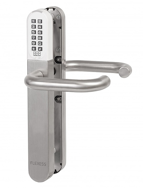 Maasland Flexess Aero Extra elektronisch deurbeslag is een gecombineerd codebeslag en kaartleesbeslag die eenvoudig op mechanische sloten kan worden gemonteerd. Flexess Aero Extra deurklinken met code werkt op batterijen dus bekabeling is niet nodig. Bediening kan via een zelfgekozen code of MIFARE® kaarten/tags. Programmering is eenvoudig en kan zonder extra apparatuur. De kruk aan de binnenzijde is altijd vrij te bedienen.