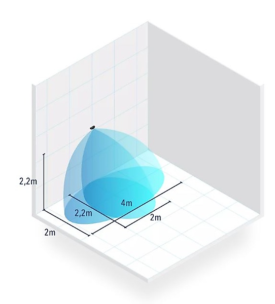 - Max. detectieveld Breed : 4 m x 2 m | Smal : 2 m x 2.22 m @ 2.2 m hoog